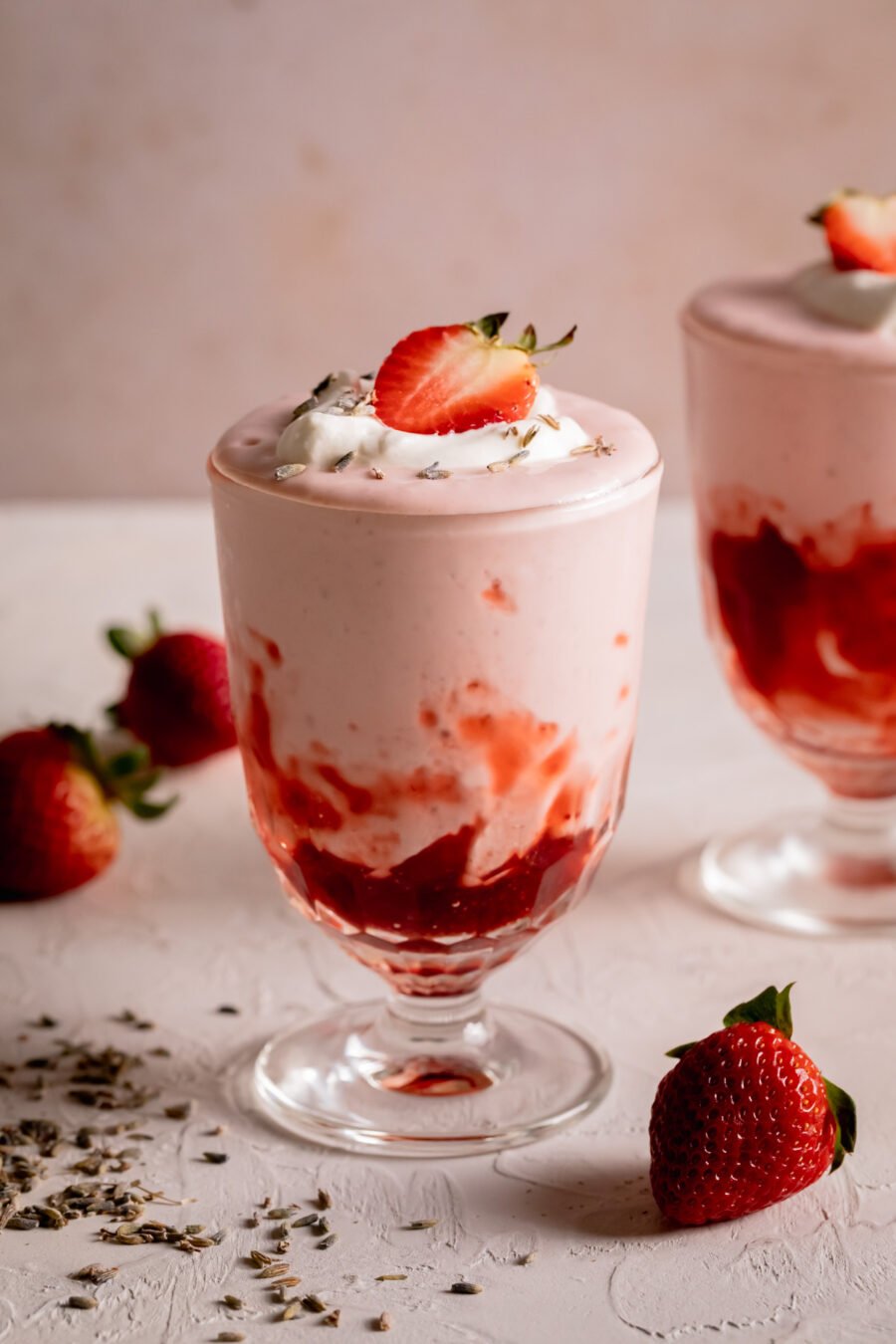 A fruity and floral dessert topped with homemade whipped cream and layered with strawberry jam.